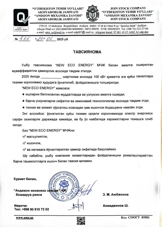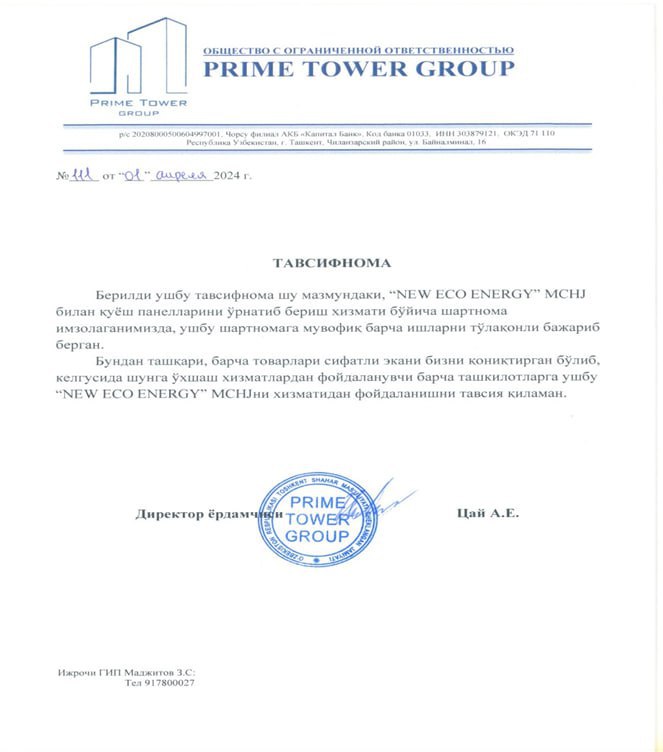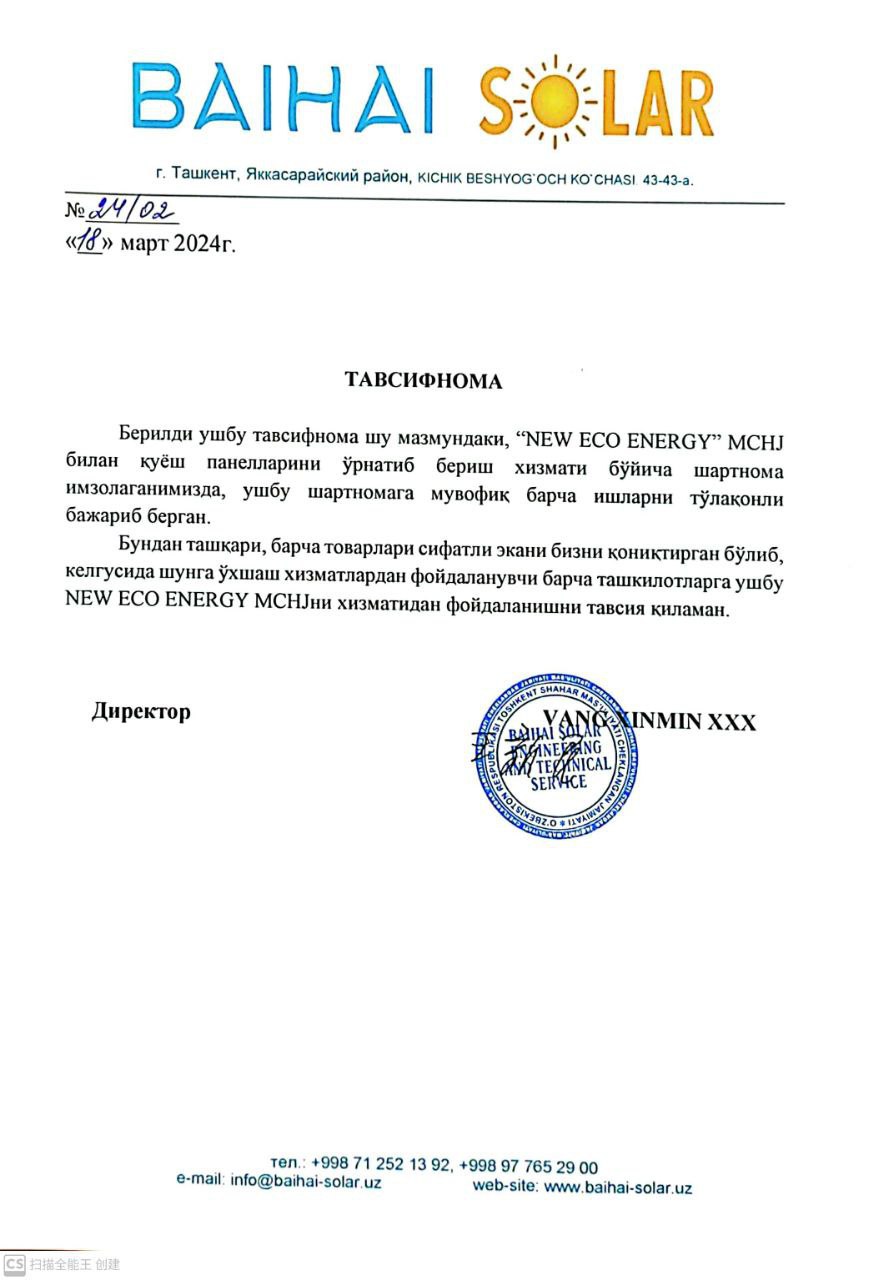 Biz yirik quyosh fotoelektr stansiyalariga qurishga ixtisoslashgan professional muhandislik kompaniyasimiz. Biz barqaror rivojlanish, energiya samaradorligi va ekologik toza texnologiyalar asosida quyosh fotoelektr loyihalarini loyihalash, qurish va ishga tushirish bo‘yicha to‘liq yechimlarni taklif etamiz.