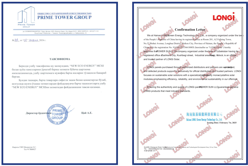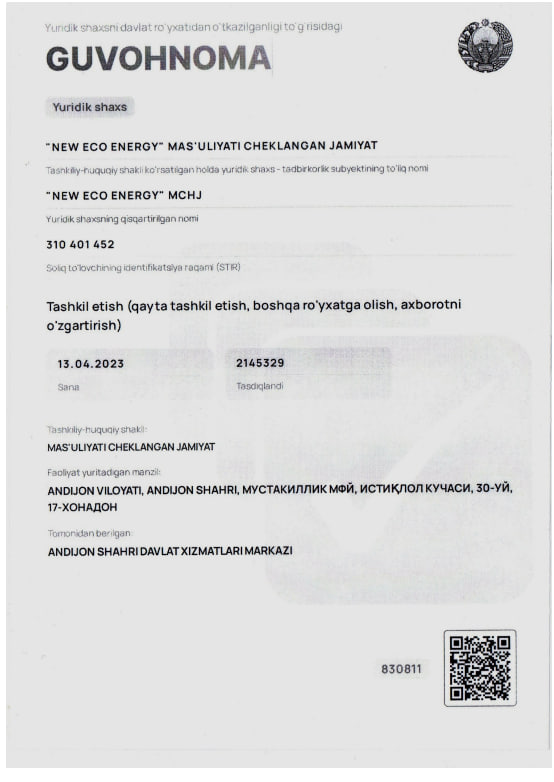 Biz mahalliy va xalqaro miqyosda tan olingan sertifikatlar va litsenziyalarga ega bo‘lishimiz bilan faxrlanamiz, ular sifat, xavfsizlik va barqarorlikka bo‘lgan majburiyatimizni tasdiqlaydi.